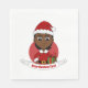 Napkins med en illustration av en söt, leende afrikansk flicka med svart hår från kort bär flickan en Jultomten-dräkt med röd hatt och en present; i en röd cirkel på vit bakgrund, med en redigerbar textmall för ditt namn eller meddelande