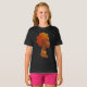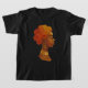 Afroamerikansk flicka med blommor i håret. Söt stark kraftfull. Rik gyllene smycken. röda orange nästan gyllene blommor.