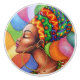 Stilized African Woman porträtt, klädd och omgiven av Ljusa färger Vax Fabric Design. Original Hand Teckning Copyright BluedarkArt.