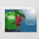 En söt liten älg som håller upp löv på ett grönt äpple. Visas mot ljus till mörk blått bakgrund. Ett underbart sätt att erkänna en speciell flickfödelsedag.