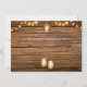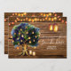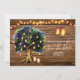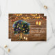En underbar och livfull illustration med en stor ek träd fylld med faux-skuggande hängande lyktor och sträng ljus mot en brun träbakgrund. Den övre och grund kant har oval korgvide rattan basket som är belyst mot den gyllene bakgrunden. Små löv i grönt är utspridda nedanför träd och vita mallar visas på högerna för din personlig. Dessa är idealiska för att land ska kunna falla/hösten, sommaren, vår eller vintern "spara datummeddelanden". Dessa lyxiga platta kort med elegant kommer att glädja dina gäster.