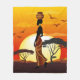 Vackra Woman African Silhouette klädd med Vax traditionella Fabric Dress, med en hand gjord av dekorerat burk, Walking in the Fantastisk Nature of the African Savanna, på en varm och fredlig solnedgång. Original Vector Illustration Copyright BluedarkArt ChameleonArt.