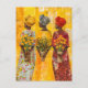 Tre afrikanska kvinnor i färgfulla klänningar som håller blommor. En levande illustration av kulturell skönhet och tradition.
