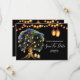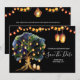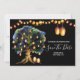 En underbar och livfull illustration med ett stort ekträd fyllt av falska lysande hängande lyktor och slingor av lampor mot en bakgrundsfärg som du väljer. De övre och nedre kanterna har ovala korgar av flätad rotting som är upplysta mot den gyllene bakgrunden. Små gröna blad är utspridda under trädet och vita mallar visas till höger om det för dina personliga detaljer. Dessa är idealiska för rustika landliga höst-, sommar-, vår- eller vinters "spara datum"-meddelanden. Dessa lyxiga och eleganta platta kort kommer att glädja dina gäster.
