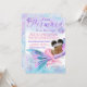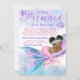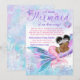 Långdistans baby shower via post baby shower inbjudan med söt afrikansk baby sjöjungfru med snygg afro frisyr och vacker rosa svans på en vacker rosa, lila och tealblå sjöjungfrustjärt och undervattensbakgrund. Denna sjöjungfru baby shower inbjudan är lätt att anpassa med dina detaljer.
