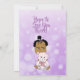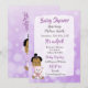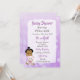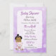 Hispanic eller afroamerikansk babyflicka med teddybjörn Baby shower-inbjudningar med lila bakgrund.