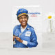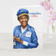 Grått hår, brun hud, afroamerikansk kvinnlig postarbetare rolig kort för att gratulera henne till Postens pensionering genom att lägga till hennes namn på ID-märket på kortets framsida.