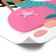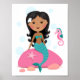 Snygg affisch med en afroamerikansk liten sjöjungfru seriefigur med svart hår och mörk hy som sitter på en sten med en sjöstjärna och sjöhäst på en vit bakgrund. Rolig design för flickor, även tillgänglig med brunt och blont hår. Snygg väggkonst för barnkammare eller pojk- och flickrum.