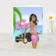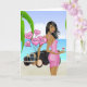 Afroamerikanskt Alla hjärtans dag-kort med kvinna som står bredvid klassisk bil på stranden.