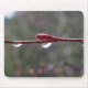 Fresh raindrops cling to a slender red branch, suspended against a soft, blurred background. The simple composition highlights texture, light, and the quiet detail of a moment after rain.