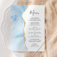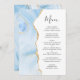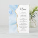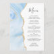 Den moderna bröllop-menyn på den lämnat kant i eleganten har en baby blue vattenfärgad agate gräns som trimmas med faux guld glitter. I anpassadet kombineras handskriftsskript och kapslad typsnitt i grått i kol mot vit bakgrund. Den omvända sidan har en passande baby blue och guld agate-design.