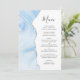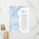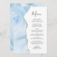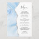 Den moderna bröllop-menyn på den lämnat kant i eleganten har en baby blue vattenfärgad agate gräns som trimmas med faux silver glitter. I anpassadet kombineras handskriftsskript och kapslad typsnitt i grått i kol mot vit bakgrund. Den omvända sidan har en passande baby blue och silver agate-design.