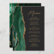 Denna eleganta moderna bröllopsmeny har en smaragdgrön akvarellagate-kant dekorerad med falskt guldglitter. Den anpassningsbara texten kombinerar guldfärgad handskriven script och sans serif-teckensnitt på en mörk bakgrund. Den gröna och guldfärgade agate-designen upprepas på baksidan.