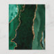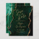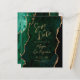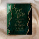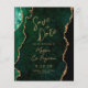 Med det här elegant bröllop kan du spara datumkortet med en bakgrundsbild av en vattenfärgad agate i grönten emerald som trimmas med faux guld glitter. Anpassadet kombinerar modern handskrift, tryckplåt och kursivt typsnitt med guld-färgad. Den omvända sidan har en samordnande grönt och guld agate-design.
