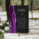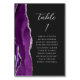 Det moderna kortet för bordsnummer i bröllop som är lämnat kant i eleganten har en lila vattenfärgsagat i gräns som trimmas med faux silver glitter. Ord "bord" visas i handskriftsskriptet silver grått på en svart bakgrund. Lägg till namnen för de gäster som tilldelats varje bord.