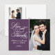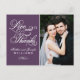Djup och dramatisk, detta tack-kort har en rik äggplanta-panel med "Kärlek och tack" i svepande vit utsmyckad kalligrafi-bokstav bredvid er bröllopsfoto. De anpassningsbara namnen på paret visas i vit skript och fet stil, med en dekorativ svepning nedan. Ett djärvt val för par med en vinter-, modern eller juvel-tonad bröllopsestetik.