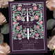 Sätt tonen för ditt medeltida fantasy-bröllop med en djärv inbjudan design - ett storslaget svärd omgivet av blommor mot en äggplatsby bakgrund. Perfekt för par som drömmer om en episk, romantisk firande. Anpassa den efter dina behov. OBS: Det silver som ingår i denna design är INTE riktig folie.
