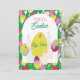 Söta kaniner med påskägg på vacker tulpanmönsterbakgrund med högtidlig stämning.