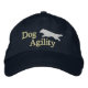 Den här broderade hatten har en benvit hoppande Gräns Collie-silhuett över ord "Agilitet" med "Hund" till högerna. Fantastisk Gräns Collie-hatt för alla som testar med hund.