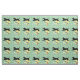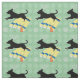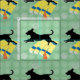 En svart skuggsilhuett av hund med öron och en svan som flyger lämnar ett stort hopp. Bakgrunden är grönt med spridning av tass avtryck.