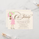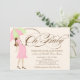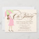 Denna baby shower inbjudan har orden "åh baby" i en elegant brun skrift bredvid en söt grafik av en gravid kvinna i rosa som håller ett rosa och ljust grönt paraply. Grafik ©JW Illustrations.