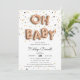 Unika babykalasinbjudningar med "OH BABY" stavade med rosa guld ballonger, på en bakgrund av rosa guld, guld och svart konfetti. Personifiera med din baby showers detaljer i modern svart stil. Inbjudningarna har en enfärgad rosafärgad baksida.