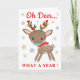 Kortet har en söt festlig renare med mask och snöflingor med "OH HJORT VAD A YEAR"-meddelande. Anpassa insidan med ditt julmeddelande eller ta bort det för ett tomt kort.