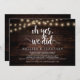 Åh ja, det gjorde vi, bröllopsflykt kungörelse / inbjudningskort, i lantlig gårdsträ, strängljus design. Detta är perfekt för din bröllopsmottagning och efterbröllopsfirande. Lägg till dina detaljer i matchande typsnitt / bokstäver.
