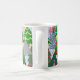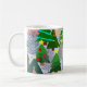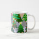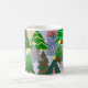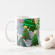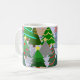 Mugg har en utformning av Julgranar i olika skuggor av grönt, rosa, silver och guld med olika dekorationer.
