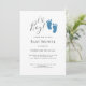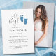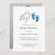 Denna enkla och stilrena inbjudan till babyfirande är dekorerad med söta bebisfötter i blå glitter och orden, Åh pojke!