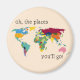 En vacker magnet med en färgfull världskarta och ord 'åh, stället du åker' för din lilla.