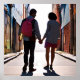 Ett par i kärlek som går längs en stadskorg som håller händer i djupa samtal. Bläckbild. Vad får du från bild?
