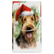 Färgfull och glatt juldesign med en Airedale Terrier med en julhatt.