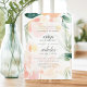 Modern bröllopsinbjudan i pastellfärgerna i blommigten innehåller bröllop-detaljer under mjuk grått-kalligrafi och blockering, som läggs över på en bakgrund av blommor i lush abstrakt i persiko- och mynta grönt. Stil har en traditionell ordalydelse med brudens föräldrar som värd, men kan lätt ändras till kostym i bröllop.