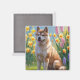 En glad hund sitter fredligt på lush grönt gräs, omgiven av färgfulla vår blommar under ett mjukt blå himmel. Den här digitala oljemålningen fångar upp ett ögonblick med uttryckliga penseldrag, varmt färg och en känsla av varm glädje.
