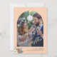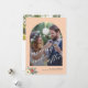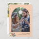 Modern typografi-skript är ett vackert skript efter orangen apricot bröllop-annonseringskort med bågfoto, anpassningsbar och en liten botanisk blommigt bouquet i säsong.