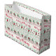 En stor presentsäck med en upprepande mönster i bakgrunden, i en ful julsötare stil. Mönster består av strumpor, julklappar bollar, stjärnor och snöflingor. Med röd text som upprepar God jul. Roligt och festlighet.
