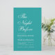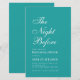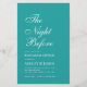 En enkel, minimalistisk akvamarinfärgad inbjudan till repetitionens middag. Den har bara vit text på akvamarinfärgad bakgrund. Titeln "Kvällen innan" är skriven med elegant kalligrafi, tillfället "Repetitionens middag" och namnet är skrivna i större versaler, resten i små versaler. Texten är vänsterjusterad.