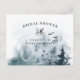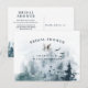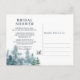 Akvarell av berg, skogsträd, skogsuggla djur för en bröllopsdusch inbjudan vykort. På andra sidan finns duschinformationen som kan anpassas.