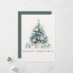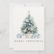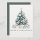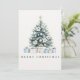 Skicka varma hälsningar insvepta i tidlös elegans med detta vackert illustrerade akvarelljulkort. Med en lugn grön julgran prydd med mjuka blå dekorationer, vintervita julstjärnor, krönt med en silverstjärna och ömt inslagna presenter i blå och neutrala toner vid foten. God Jul-hälsning i typsnitt som matchar illustrationen nedan. Det falska strukturerade bakgrunden och designen fångar andan av en mysig, klassisk jul. Enfärgad och anpassningsbar högtidshälsning och signatur på baksidan.