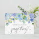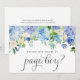 Detta sidpojks-förslagskort har en mjuk akvarell blomsterkrans av blå hortensior, elfenbensvita rosor och gröna accenter. Den klassiska designen gör det till ett bra val för vår- eller sommarbröllop, trädgårdsceremonier eller rustika teman. Personalisera kortet med din sidpojkes namn och ett kort meddelande för att skapa ett minne för alltid. Oavsett om du frågar en yngre bror, systerson eller familjevän, är detta kort ett genomtänkt sätt att inbjuda honom att vara en del av din bröllopsdag.