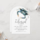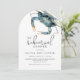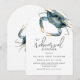 Den perfekta bröllopsrepetitionens middagsinbjudan för middagar längs kusten, denna populära bågformade design har en blå krabba på den övre kanten i levande akvareller. Den medföljande inbjudantexten är modern med en avslappnad elegans som är både smakfull och gästvänlig. Anpassa textmallen med dina specifika detaljer. Denna inbjudan är ett underbart val för middagar vid bröllopsrepetitioner i kustnära områden eller middagar där skaldjur serveras.