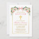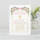 Elegant akvarell rosa vit blommig dopinbjudan med rosa rosor, vita blommor och grönska. Guld kors. Rosa rodnad band. Guld ram.