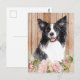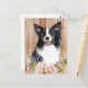 Realistisk svart-vit Border Collie hund akvarell porträtt illustration med vacker blomsterbukett på falsk träpanel bakgrund.