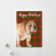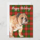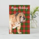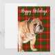 Julkort med akvarellillustration av söt bulldog på festlig grön och röd rutig bakgrund och anpassningsbart julsäljande.