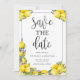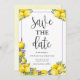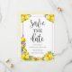 Detta vackra "Spara datum"-kort har ljusa citroner med lavendelblommor och elegant skrivstil i en tunn lila ram. Du kan anpassa texten på inbjudan för att passa din personliga information. Baksidan har en gul akvarell ombre.