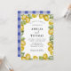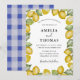 Vi presenterar en modern bröllopsinbjudan med originell konst med livfulla citronfärgade citroner och frodiga gröna blad, som vackert inramar detaljerna om ert evenemang. Den glada citrondesignen ger en fräsch och livlig känsla, medan ett stilrent blått rutmönster på baksidan tillför en charmig kontrast. Perfekt för par som söker en kombination av elegans och lekfullhet, denna inbjudan är helt anpassningsbar för att passa er unika stil och sätta tonen för en glädjefylld firande.