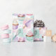 Slå in din speciella present i den förtrollande sötman hos detta inslagspapper! Det har ett fantasifullt mönster av mjuka akvarellcupcakes, var och en i en lila, grön eller rosa omslag, krönta med virvlar av rosa och vit frosting. Spridda bland godsakerna finns lekfulla lila/teal-rullningsstift med trähandtag och ömtåliga metallvispar, allt mot en mjuk rosa, grön och vit rutig bakgrund. Denna design är det perfekta komplementet till presenter från Mommy & Me Baking Collection, som ger en glad presentation för födelsedagar, bröllopsdusch eller någon söt firande.