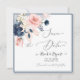 PixDezines akvarellblommor i dammig skifferblå, rosafärgade rosor och vackra blå eukalyptusblad. Spara datum med modern kalligrafi.