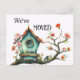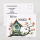 Elegant vi har flyttat ny adress ankomstkort med akvarell fågelhus med fågel, blommor och fjäril.